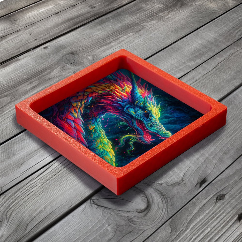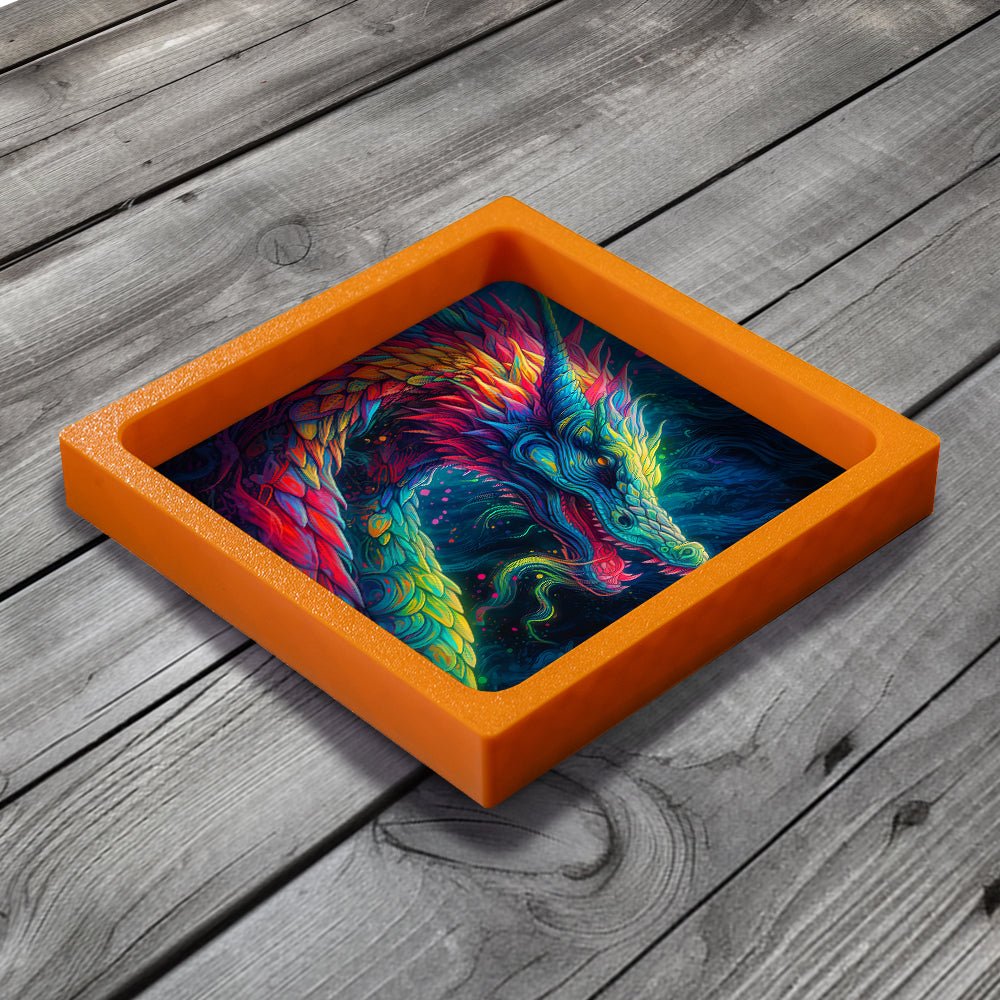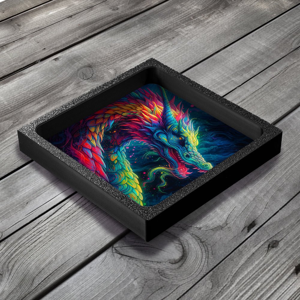 This Dice Tray is the perfect gift for fans of Tabletop Gaming, Board Games, Wargames and DnD. Our unique design combines a PLA plastic frame with a lined neoprene surface with MDF backing board, giving a lightweight but solid dice tray.